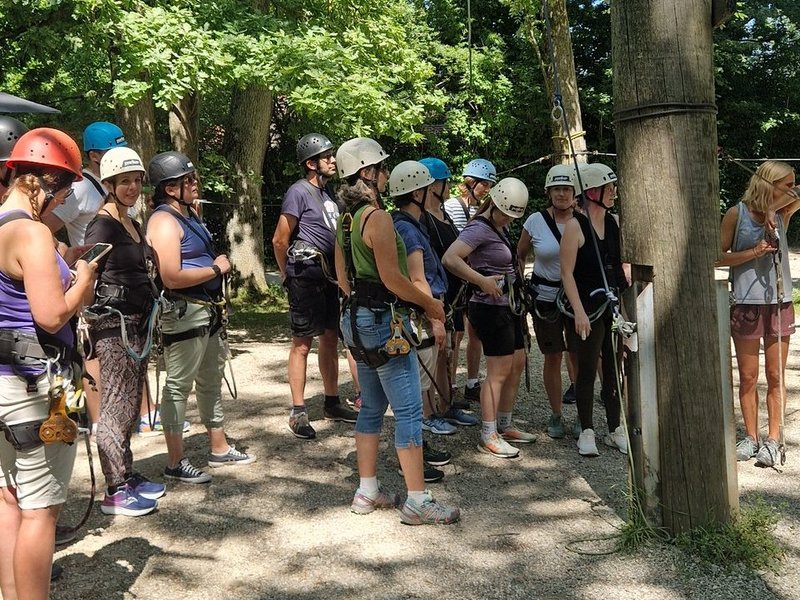 Frau Müller konnte mit Parker Outdoor in Übersee am Chiemsee einen sehr passenden und sympathischen Anbieter für eine Teamentwicklungsaktion mit Hochseilgarten und Bogenschießenkurs für unser Betreuungsteam organisieren. Alle Teilnehmer/-innen hatten mächtig Spass. Es war eine gute Kombination aus Action, Entspannung, Zeit für Gespräche und Vernetzung, Kooperation, Kommunikation und Genuss. Manche/-r Kollege bzw. Kollegin kam an die eigene Grenze und musste die Komfortzone verlassen. So wachsen wir an Herausforderungen und durch das Überwinden von Ängsten. Die Höhe und die erforderliche Geschicklichkeit und Kraft waren wirklich eine Herausforderung. Zum Abschluss gab es am wunderschönen Chiemsee eine deftige Brotzeit am Strandcafe. Alle Teilnehmenden waren sich einige: ein rundum gelungener Ausflug.