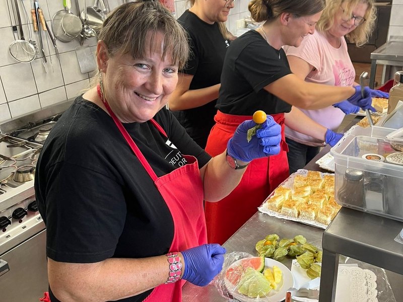 Anschließend traf man sich erneut im Speisesaal bei Kaffee und Kuchen, die, wie der Mittags-Imbiss auch, von der fleißigen Küchenmannschaft gemeinsam mit Mitarbeitenden zubereitet worden waren. Für musikalische Unterhaltung sorgte die hauseigene Gesangsgruppe, bestehend aus sechs Bewohner/-innen und dem Hausleiter. Mit bekannten deutschen und englischen Liedern begeisterten sie das wunderbare Publikum, das begeistert mitsang. Zum Abschluss wurden die Sieger der Hausolympiade geehrt.