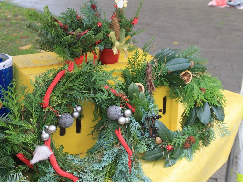 Adventsbasar: Weihnachtsgestecke zum Verkauf