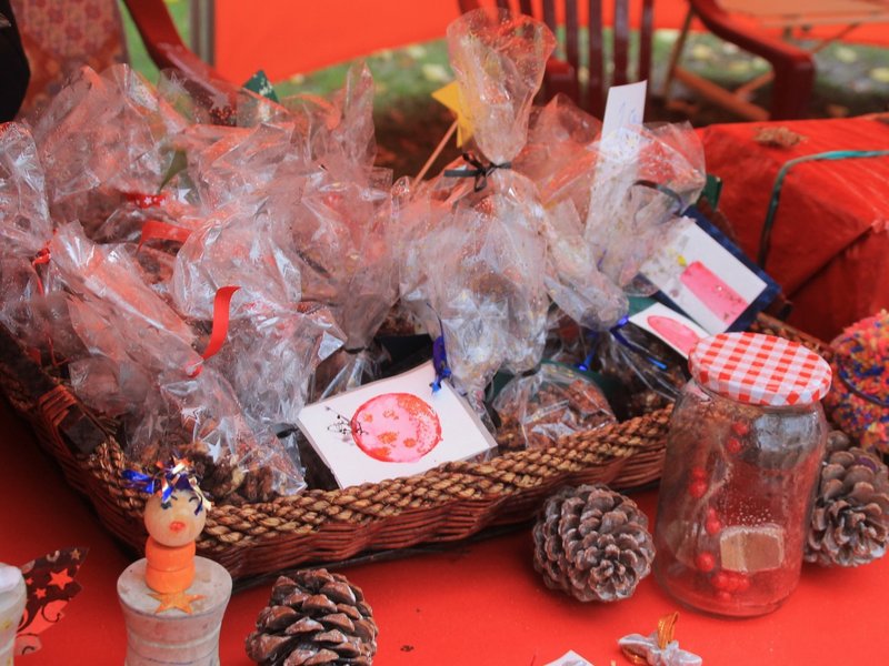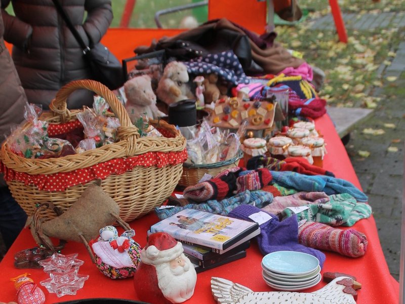Adventsbasar: Tisch mit Dekoartikel zum Verkauf