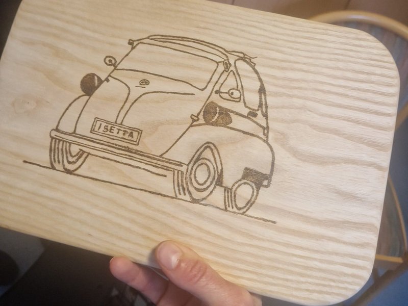 Die BMW Isetta hat Herr H. mit einem Brennstab in das Brett gezeichnet.