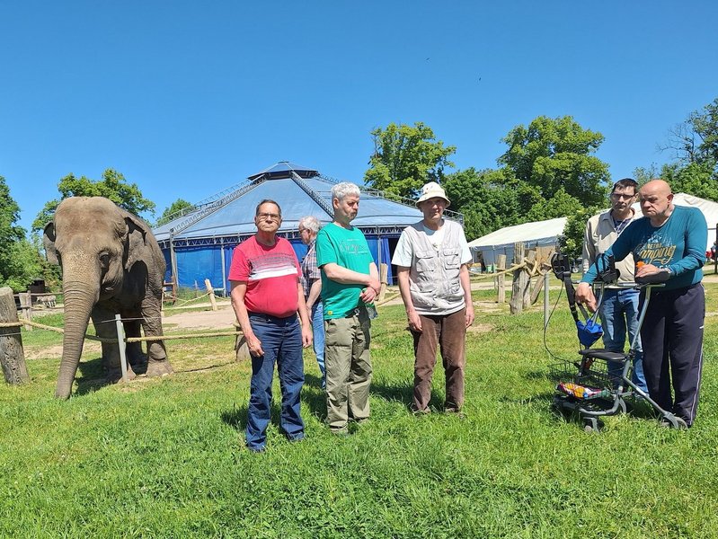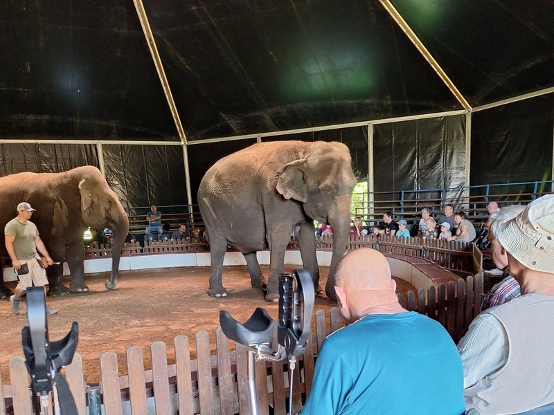 Nach einer halbstündigen Fahrt sind unsere Bewohner/-innen auf dem Elefantenhof in Platschow (Mecklenburg-Vorpommern) angekommen und schon ging es mit einer Vorführung der zwei asiatischen Elefantendamen Susi, geb. 1969 und Vana, geb. 1959, los.