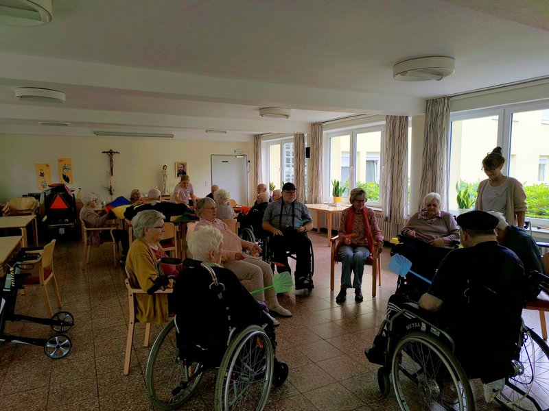 Das triste Wetter hinderte aber weder Bewohner/-innen noch Gäste daran, gemeinsam bei Sport und Fitness viel Spaß zu haben. Der aufgebaute Parkour mit Bällen, Schwungtuch, Tisch-Krocket, Luftballon-Klatschen und Klettdartscheibe versprach Bewegung und Vergnügen. Wir wechselten immer wieder die Plätze. Besonders viel Spaß hatten alle beim gegenseitigen Luftballonzuspielen - nur mit Fliegenklatschen, was zudem alle zum Schwitzen brachte. Das Miteinander und der Spaß standen bei der Bankbegegnung im Vordergrund. Anfängliche Skepsis beispielsweise von Herrn R. „Wie, ich soll spielen?“, verflog sehr schnell, als er merkte, dass die Aufgaben richtig Spaß machten, aber auch schwierig waren. Einen Tischtennisball in einen kleinen Behälter zu werfen, ist nicht ganz ohne. Alle Mitspielenden stellten fest, dass die anderen es auch nicht besser konnten und trotzdem alle miteinander viel Spaß hatten. Zum Abschluß der sportlichen Bankbegegnung versuchten wir uns am Schwungtuch: einen Ball im Uhrzeigersinn über das Schwungtuch laufen lassen oder gemeinsam Schwung holen, um den Ball hoch in die Luft zu werfen. Gar nicht so einfach! Nach einer Stunde Sport, Spiele-Spaß und Fitness war die ordentliche Begegnung auf der Bank schon wieder vorbei.