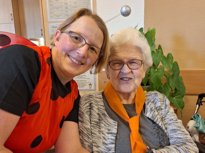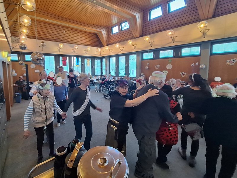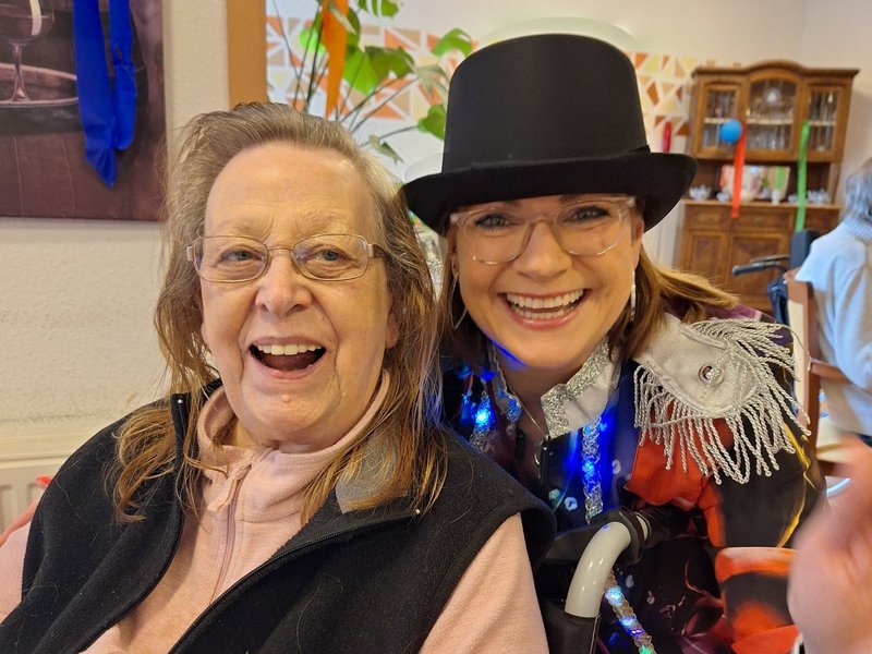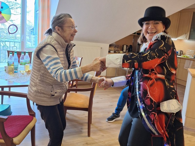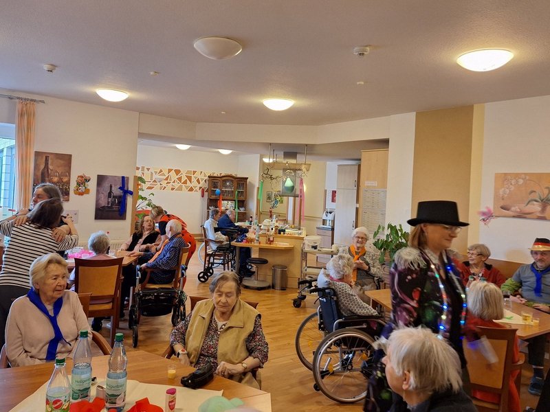 Am 27. Februar ging es hoch her beim Altweiberfasching. Für die passende Stimmung sorgten Karnevalslieder: Es wurde gemeinsam angestoßen, gesungen, geschunkelt und getanzt. Unsere Mitarbeiterinnen Heike (Küche) und Frau Coenen (Verwaltung) sorgten in Kostümen verkleidet und mit lauter Musik dafür, dass sich die gute Stimmung in allen Wohnbereichen verbreitete - mit Riesenerfolg!