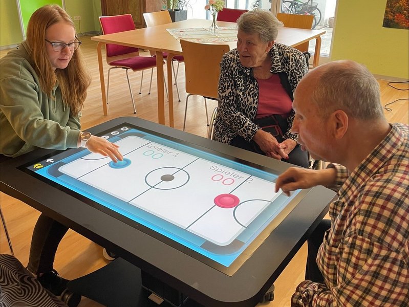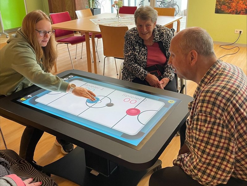 Der interaktive Touchscreen-Tisch lädt zum Spielen, Rätseln und Erinnern ein. Ob Gedächtnistraining, Bewegungsspiele oder einfach als unterhaltsamer Zeitvertreib in geselliger Runde – der CareTable bringt Spaß und fördert gleichzeitig kognitive und motorische Fähigkeiten. Besonders schön ist, dass er Menschen zusammenbringt und für viele erstaunte wie strahlende Gesichter sorgt. Wir freuen uns sehr über diese neue Möglichkeit und danken der AOK für die tolle Unterstützung!
