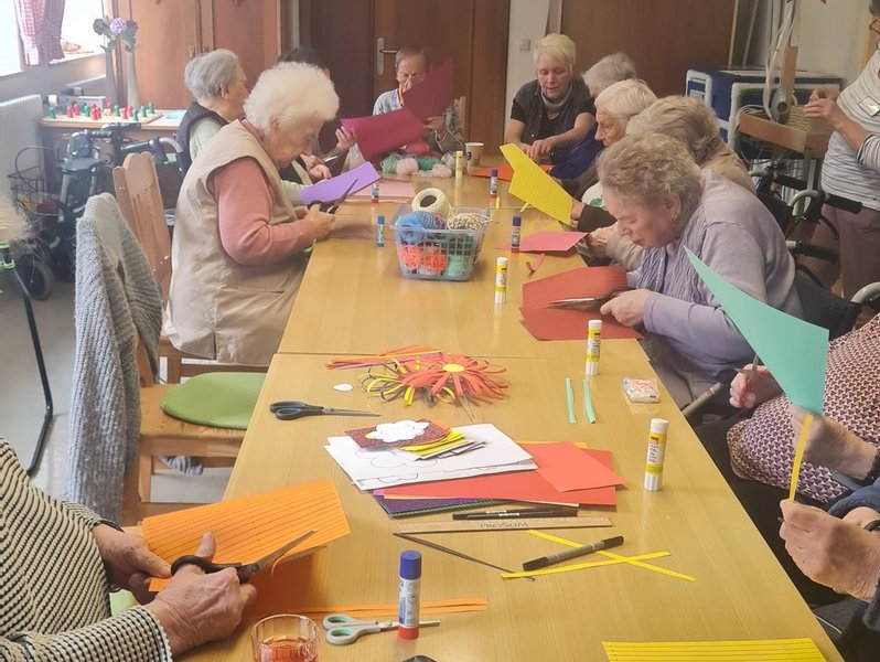 Geschick und Kreativität zeigen die Seniorinnen und Senioren aus dem Haus St. Michael: Sie basteln Fenster Blumen, um die Räumlichkeiten im Hause zum Blühen zu bringen.