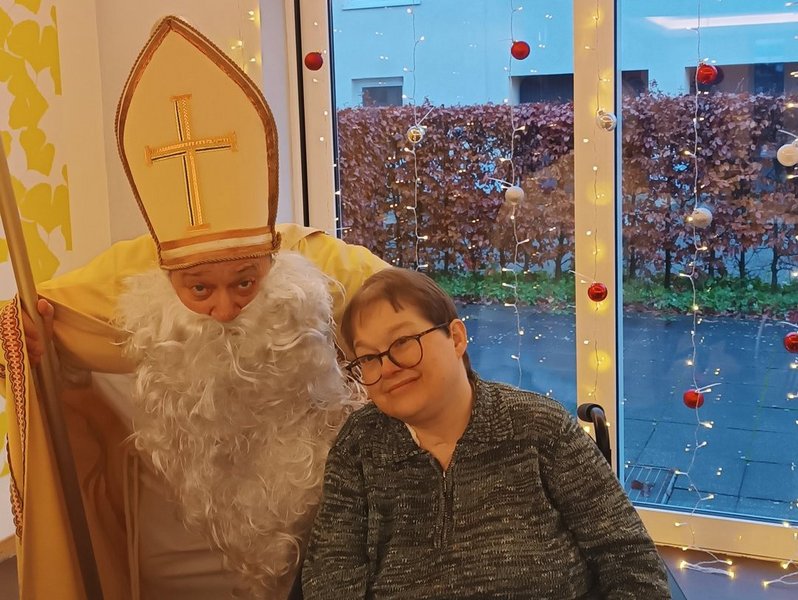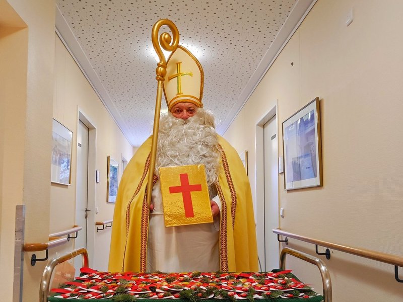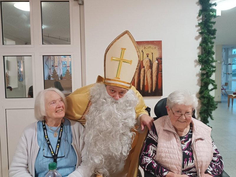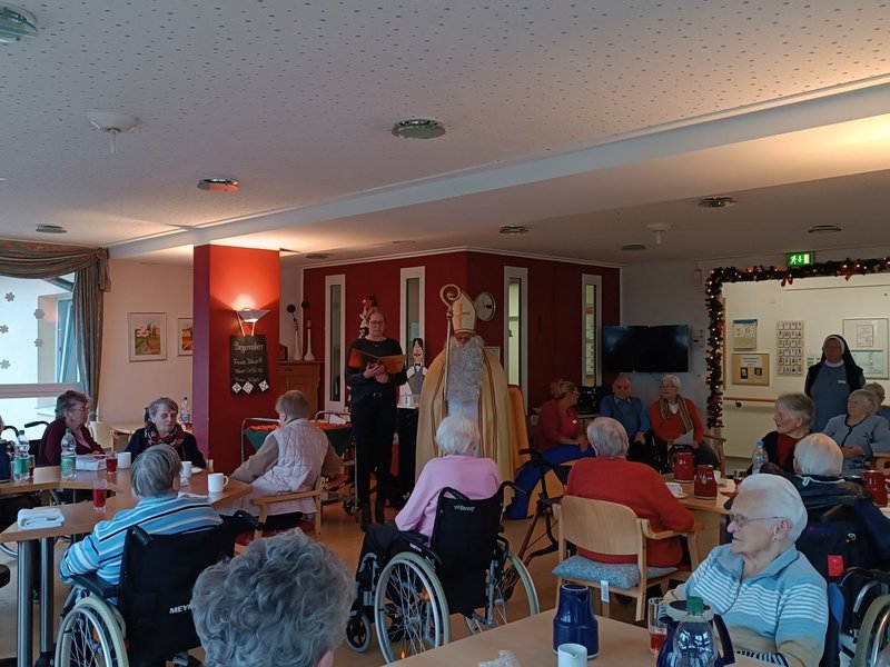 ... mit Sr. M. Patritia ging er durch die Speisesäle des St. Josefshaus und übergab jeder Bewohnerin und jedem Bewohner persönlich seinen Nikolaus Gruß.