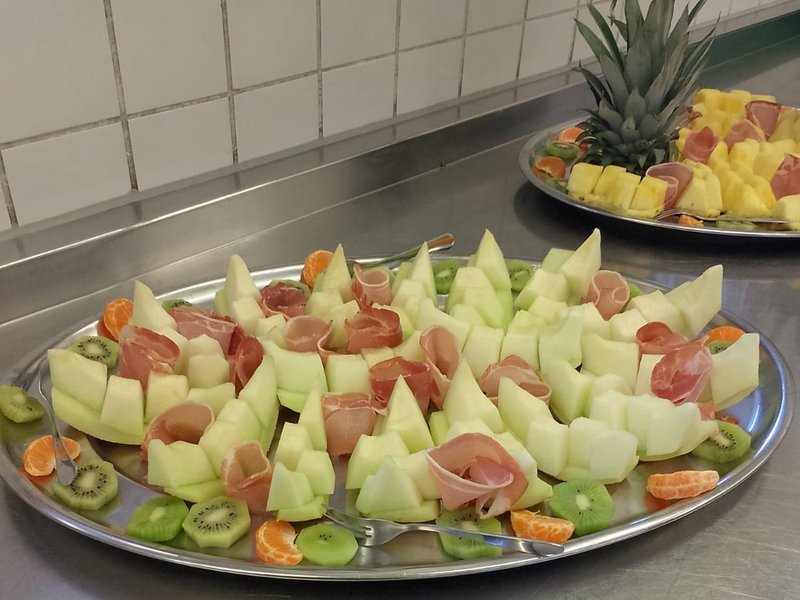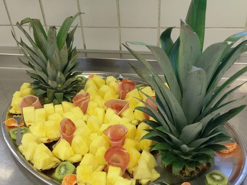 Heute präsentierte er unserer Gemeinschaft einen Gruß aus der Küche: Obst und Geräuchertes ... kunstvoll arrangiert.
