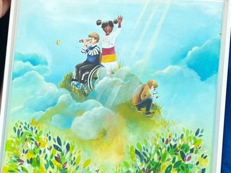 Nachträglich zur Einweihung unserer integrativen Kita „Die Entdecker vom Wolkenberg“ überreichte Michendorfs Bürgermeisterin Claudia Nowka unserer Einrichtungsleiterin Dana Brüchert das Bild einer lokalen Künstlerin, die die „Entdecker vom Wolkenberg“ gemalt hat.
