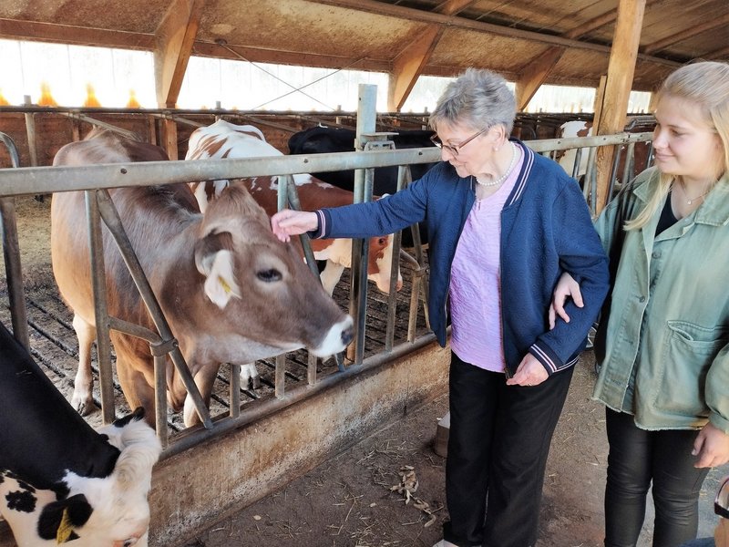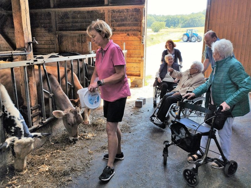 Der Landwirt erklärte dazu die heutigen Abläufe. So kam es bei einer gemütlichen Kaffeerunde auf dem Hof zu einem lebhaften Austausch. Für die Rinder hatten die Bewohnerinnen Kartoffelschalen mitgebracht, die direkt verfüttert und von den Tieren verzehrt wurden.