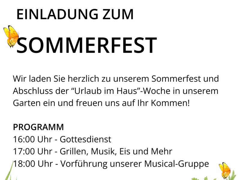 Am 04.07.2025 laden wir Sie ab 16:00 Uhr ganz herzlich zum Abschluss der "Urlaub-im-Haus"-Woche und zu unserem Sommerfest ein.