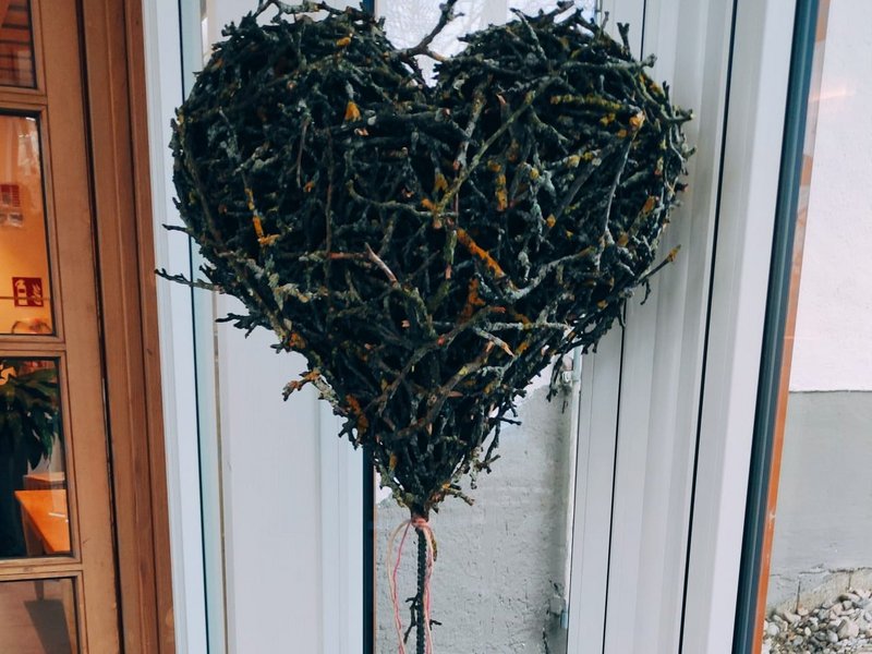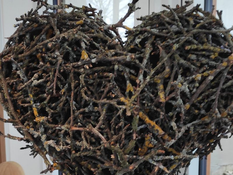 Unsere Arbeitsanleiterin, Monika Gruber, präsentiert stolz die neuesten Ergebnisse aus ihrem Bereich der Tagesstrukturierung: Flechtwerk und Brandzeichnungen.