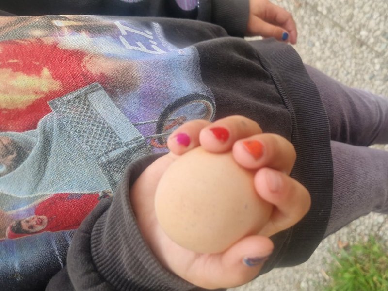 Außerdem ein frisches Ei unserer Hühner, welches Antonia - ein Besucherkind - stolz in ihrer Hand hält.