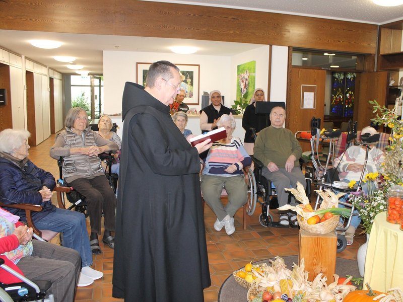 Am 9.10 wurde im Haus St. Hildegard das Erntedankfest gefeiert. Die Mitarbeiter des sozialen Dienstes im Haus sorgten für einen wundervoll dekorierten Eingangsbereich, indem die Erntedankgaben aufgestellt wurden. Um diesen Erntedanktisch herum feierten die Bewohner die diesjährige Erntedankfeier. Zuerst wurden Geschichten erzählt über den Hintergrund dieses Festes, es wurde gesungen und geprießen. Anschließend segnete der Pater die reichhaltige Ernte diesen Jahres. Auch für das leibliche Wohl wurde bestens gesorgt : Es gab leckeren Zwiebelkuchen und roten und weißen Suser dazu. Ein wunderschönes Erntedankfest 2025!