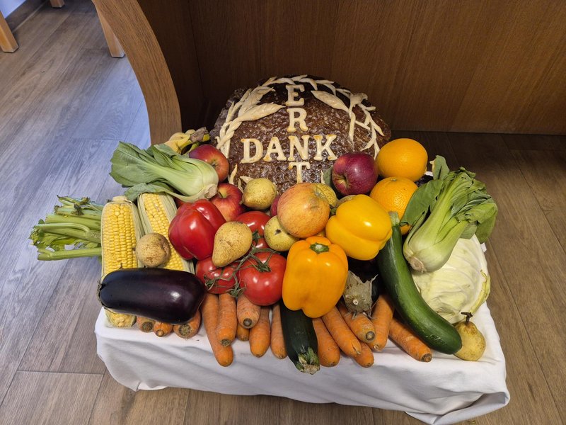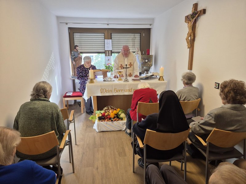 Am Sonntag feierte das Haus Maria vom Karmel traditionsgemäß das Erntedankfest - ein Tag voller Freude, Besinnung und gelebter Gemeinschaft, der Bewohnende, Angehörige und Mitarbeitende in besonderer Weise zusammenbrachte. Den feierlichen Höhepunkt des Tages bildete der Gottesdienst um 10 Uhr, den Pater Walter Orth in unserer festlich geschmückten Kapelle zelebrierte. In der Mitte, vor dem Altar stand eine prachtvolle Darstellung der Erntegaben: Bunte Kürbisse, frisches Obst, Gemüse und duftendes Brot symbolisierten die Fülle der Natur und erinnerten uns an all das, was wir im vergangenen Jahr empfangen durften. Im Rahmen des Gottesdienstes segnete Pater Orth die Ernte und erinnerte an die Bedeutung von Dankbarkeit und Achtsamkeit.