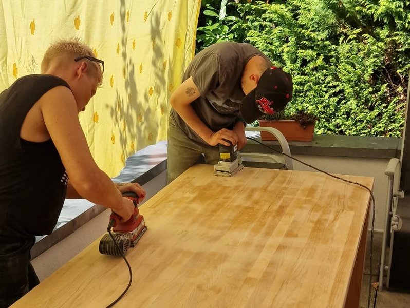 Die Mitarbeiterin und der Bewohner haben sich das richtige Werkzeug herausgesucht und ruckzuck war der Tisch wieder wie neu. Die beiden hatten einen riesigen Spaß an der Aktion.