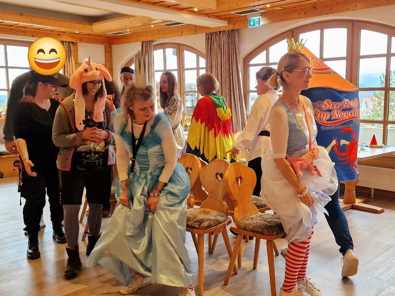 Die Mitarbeiter/-innen kamen alle bunt-crazy verkleidet: als schönste Prinzessinnen, als Luigi, als Nudlsuppn (Ramen), als Personenschützerin, als A-Promi, als Echse/Dino, als Ritter, als Papagei, als Oktopus, als Schah, als Biene, als Hund ... und, und, und ...