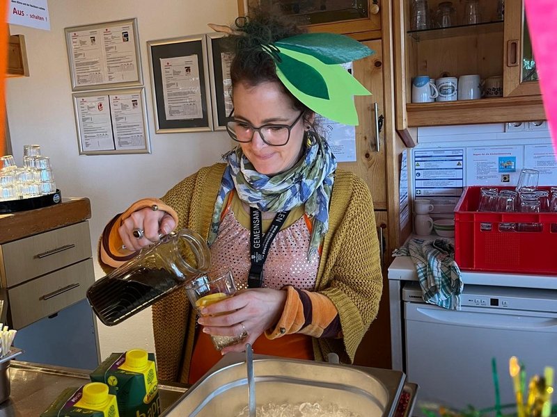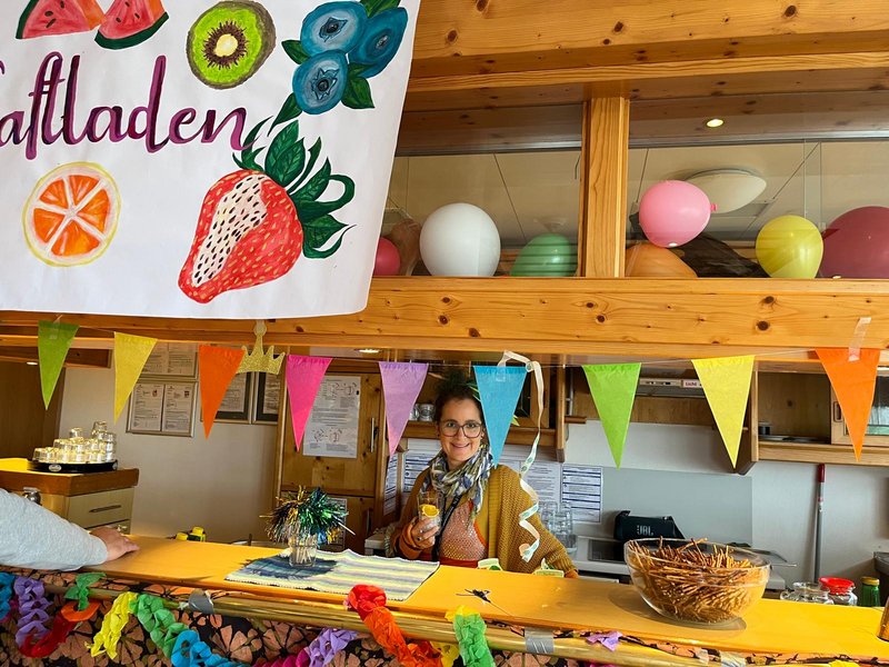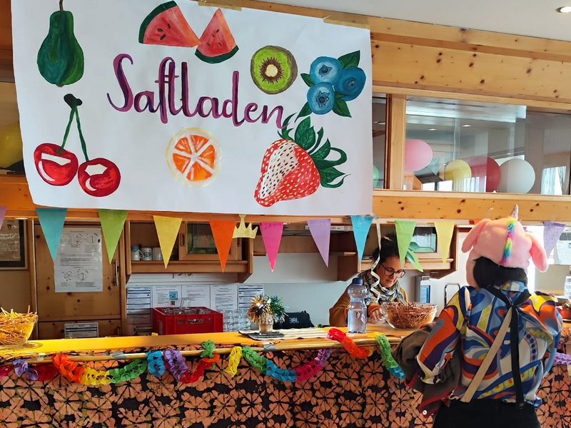 Für die Bewohner/-innen gab es allerlei Spiele, Krapfen (Gigi hat den Krapfen mit Senf erwischt) und eine coole Saftbar.