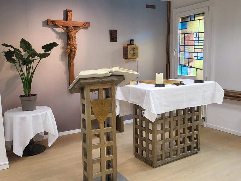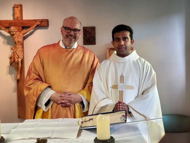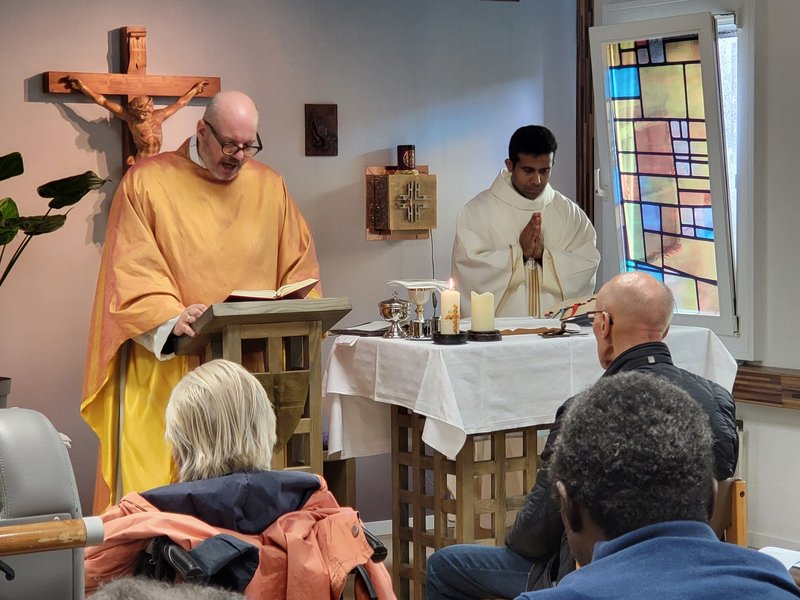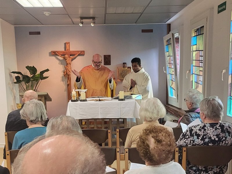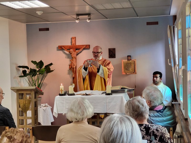 Am 1. Sonntag im April kam eine Schar von Bewohner/-innen in der Kapelle zusammen, um an der Einweihung der renovierten Kapelle teilzunehmen. Zu diesem Anlass war Pater Damian aus Köln gekommen und zelebrierte zusammen mit Pater Maneesh diese Heilige Messe. Zur Einführung erzählte Frau Eschweiler kurz etwas über die Entstehung der Kapelle in St. Raphael, die ungefähr 2011 vom damaligen Hausseelsorger, Herrn Rektor Schwarz und dem Diakon von St. Andreas, Herrn Dr. Rouette eingeweiht worden war.