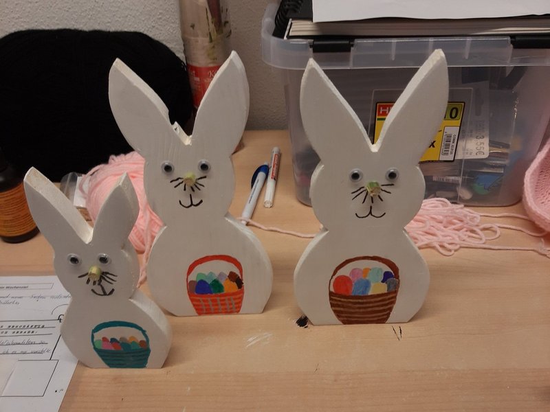 Unser Bewohner "Gigi" ist stolz auf seine ersten handgefertigten Hasen aus der Schreinerei. Wir freuen uns auf weitere Osterdeko, die dann auch in den Verkauf gehen wird. So kann die Osterzeit starten!