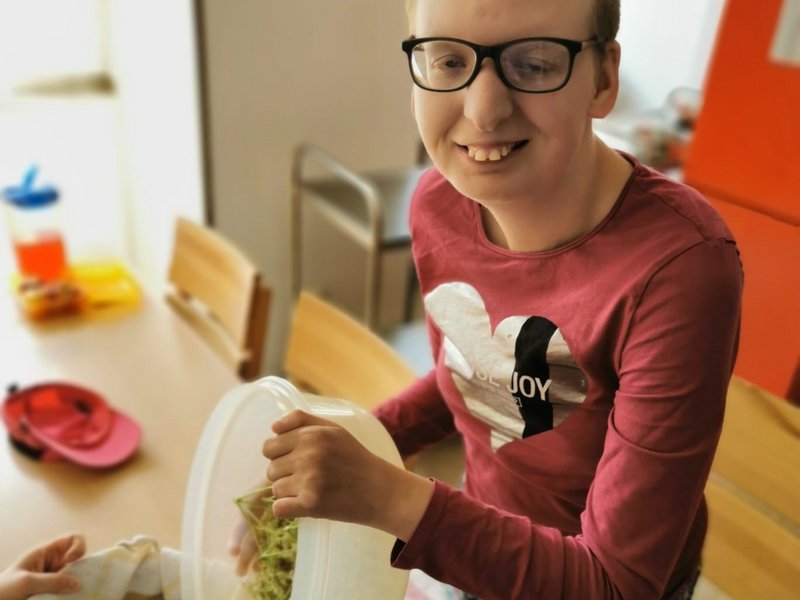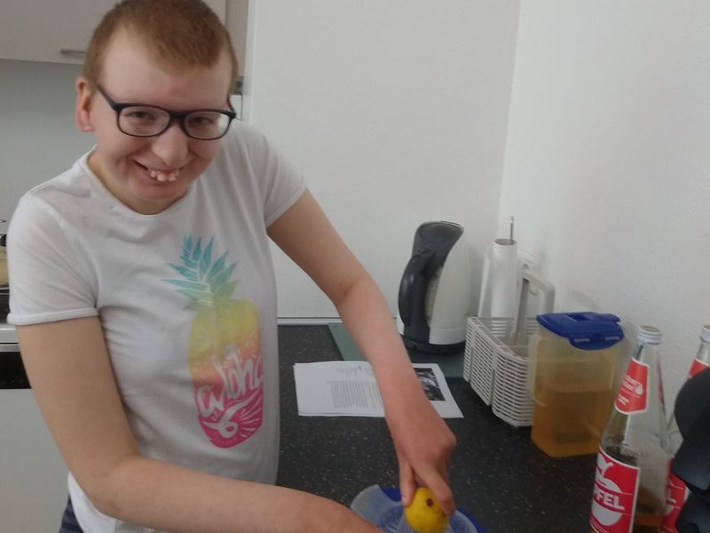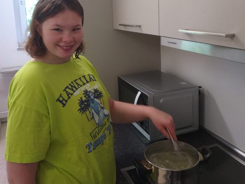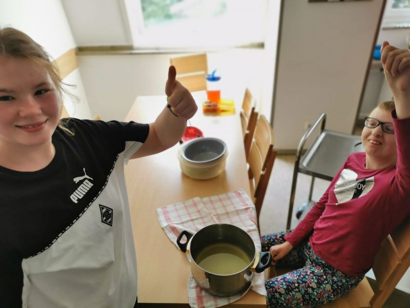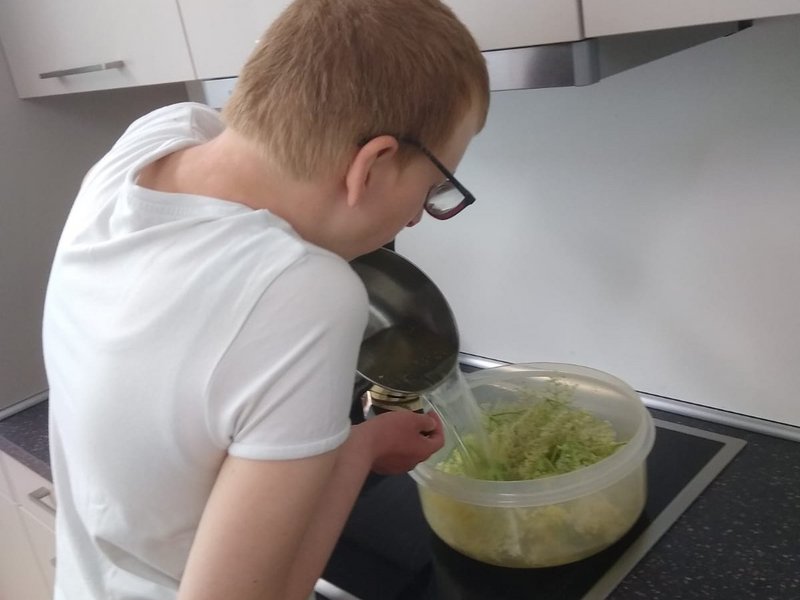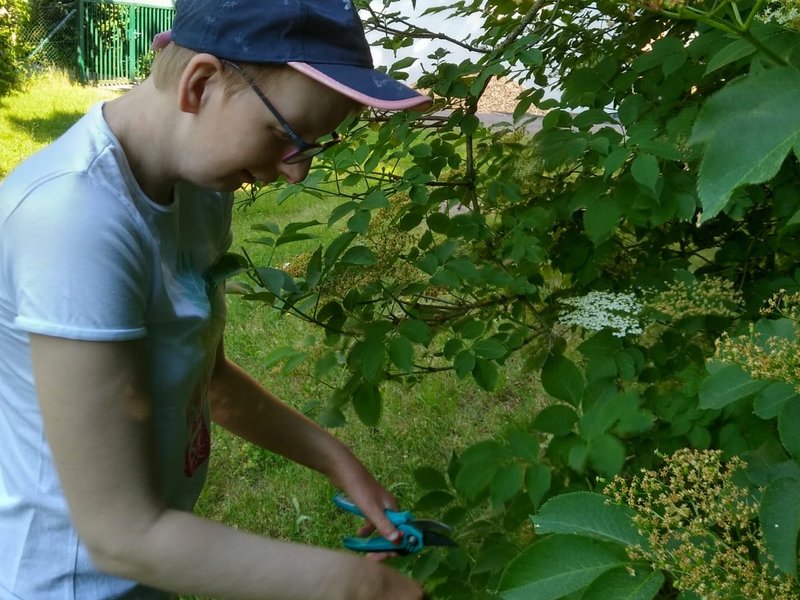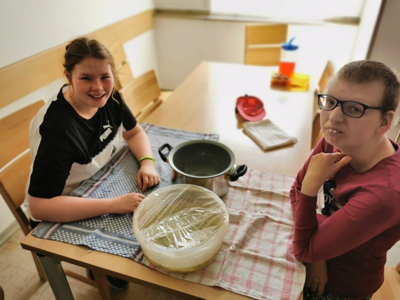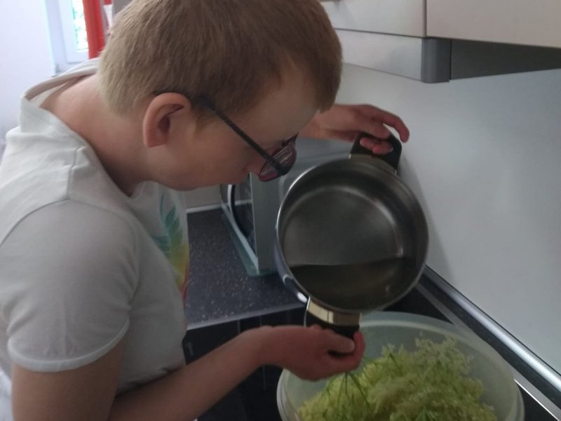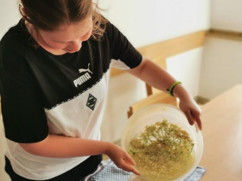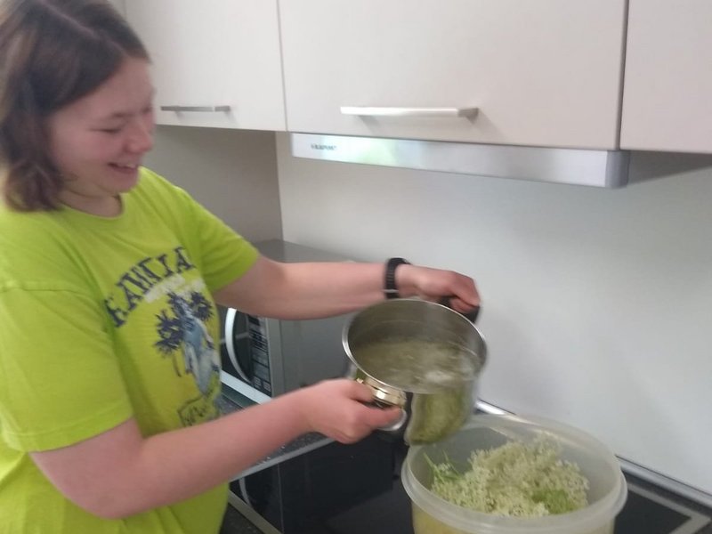 In den vergangenen Tagen haben Leonie und Sophie (Bewohnerin mit Brille) vom Wohnbereich 1, zusammen mit ihren Betreuer/-innen, auf unserem Gelände zunächst viele Eimer Holunderblüten geerntet und diese dann gereinigt, eingekocht, passiert, gefiltert und letztendlich zum herrlich fruchtig-süßen Holunderblütensirup verarbeitet.