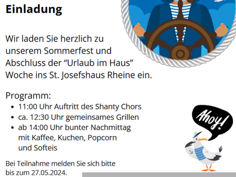 Wir laden Sie herzlich zu unserem Sommerfest und Abschluss der “URLAUB IM HAUS” Woche am 8. Juni 2024 ins St. Josefshaus Rheine ein.