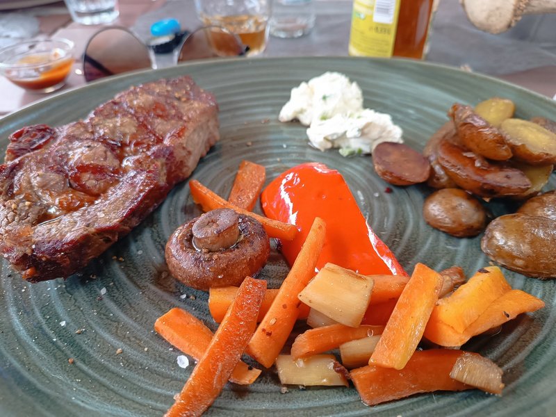 Am nächsten Tag machten die Urlauber/-innen eine Nutztiersafari auf dem Biogut Bauck, wo sie auch dieses Jahr wieder sehr freundlich von Henning Bauck und seinem Team persönlich in Empfang genommen wurden. Die Nähe zu den Tieren sorgte neben dem wunderbaren Mittagessen: Agnus-Steak mit Kartoffeln und Gemüse vom Grill für Begeisterung. Erschöpft und zufrieden konnte der Abend auf der Terrasse im Hotel mit einem gemütlichen Beisammensein verbracht werden.