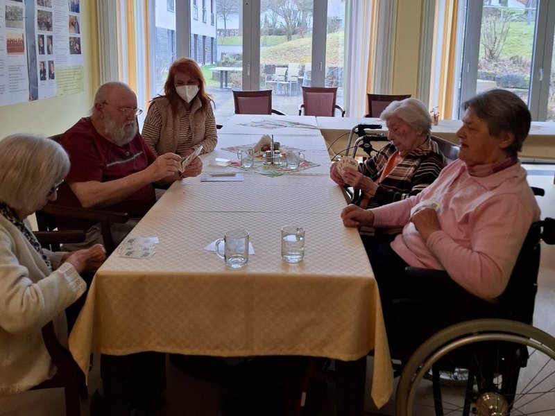 Beim alten süddeutschen Kartenspiel Binokel gilt es einige Regeln zu beachten - und die wollen gekonnt und verstanden werden! Umso mehr Vergnügen hatten alle, ihren neuen Lehrling in die Kunst des Kartenspiels einzuweihen und die Regeln zu erklären. Das vorbereitete Quizspiel wurde kurzerhand vertagt - zu vertieft waren alle in das Binokel Spiel. Christiane Schenk ist jedenfalls "infiziert": Sie möchte unbedingt alle Regeln lernen, um bald mit den Meisterinnen und Meistern am Tisch mithalten zu können. Diese freuen sich schon auf die nächste Runde.