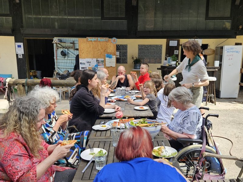 Kurzer Hand wurde überlegt, ob und wie es möglich wäre, Senior/-innen in das Hofleben des Junghof einzubinden, geträu dem Motto "Soziale Landwirtschaft"? Die Entscheidung war schnell getroffen: So finden nun regelmäßig Ausflüge auf dem Junghof statt, bei dem unsere Bewohner/-innen, Kinder und ihre Eltern einen gemeinsamen Tag mit den Tieren verbringen. Es gibt Schweine, Pferde, Gänse , Hasen und Ziegen.