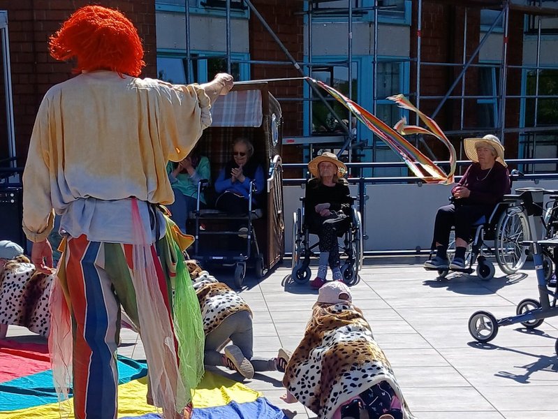 Leuchtende Augen, begeisterte Gesichter und eine Vorstellung der Extraklasse. Diese Kombination durften wir erleben, als uns die Kinder aus der DRK-Kita-Dorfstraße besuchten. Denn sie waren unserer Einladung gefolgt einen Vormittag bei uns im Haus mit einem Mitmach-Zirkus zu verbringen. Hula-Hup, balancieren und sogar eine eingeübte Nummer wurden vom Aktionsbüro „Delectatio“ in Person von Björn Geitmann angeleitet. So erlebten wir auf unserer wunderschönen Dachterrasse einen grandiosen Vormittag mit einer Vorstellung vor dem Mittagessen, die uns alle faszinierte! Dieses Format wurde uns durch die Volksbank-Stiftung ermöglicht, der wir für ihr Engagement unheimlich dankbar sind – was gibt es Schöneres als die Generationen zusammenzubringen und gemeinsam leuchtende Augen zu bekommen?