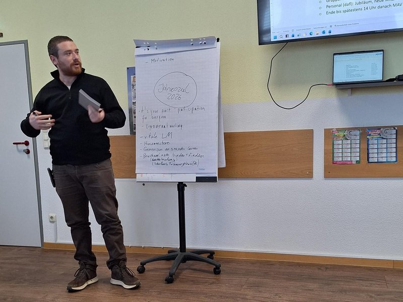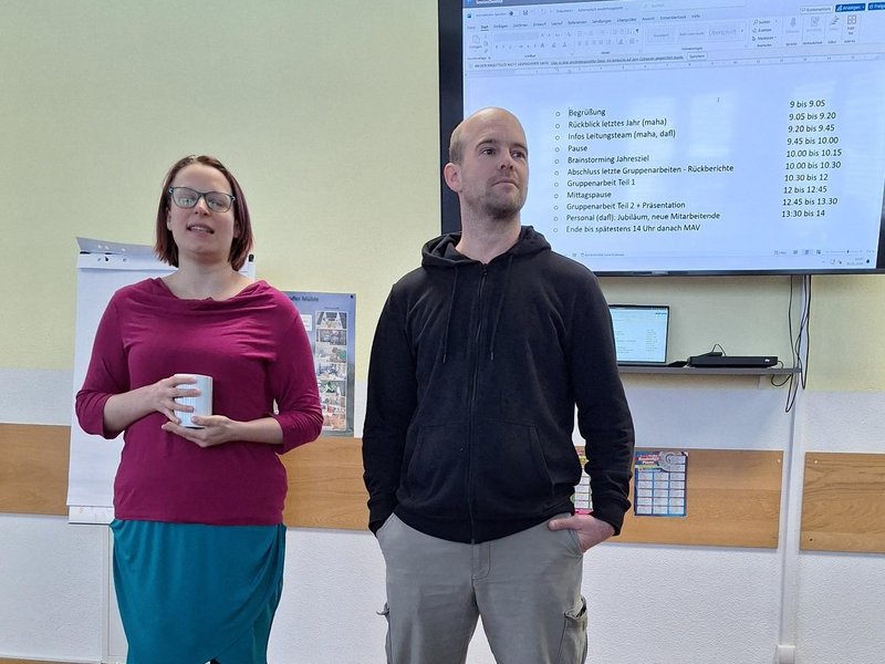 Unter dem Jahresziel "Leben meistern 2.0: Verantwortung - Gemeinschaft - Klarheit" arbeiteten die Mitarbeitenden intensiv an bestehenden und neuen Projekten. Ziel war es, Angebote der Sozialen Teilhabe weiterzuentwickeln und zugleich die Zusammenarbeit im Team nachhaltig zu stärken. In verschiedenen Arbeitsgruppen wurden bewährte Projekte wie der Hofladen reflektiert und konkrete Ideen zur Weiterentwicklung erarbeitet. Darüber hinaus entstanden neue Ansätze, unter anderem zum Zusammenwachsen im Team, der Neugestaltung von Mitarbeiterjahresgesprächen und der Planung einer Kunstausstellung.