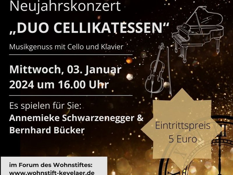 Am Mittwoch, den 3. Januar 2024 findet das Neujahrskonzert "Cellikatessen" statt und Sie sind herzlich dazu eingeladen.