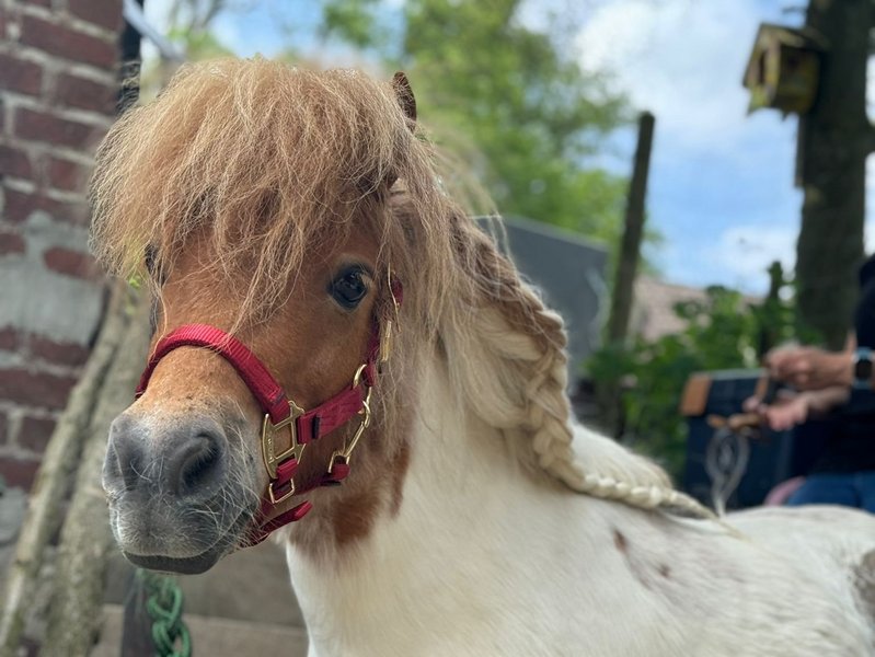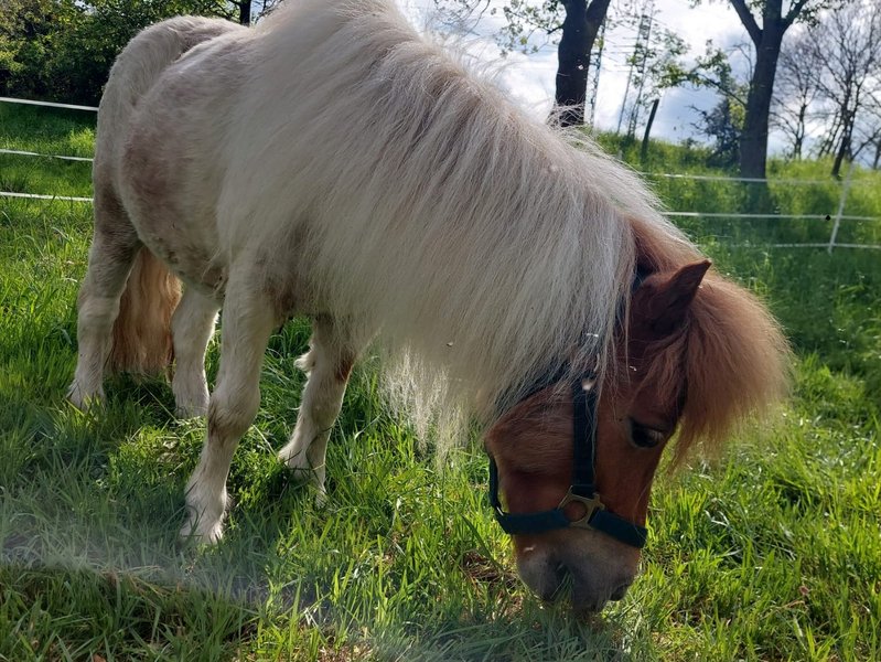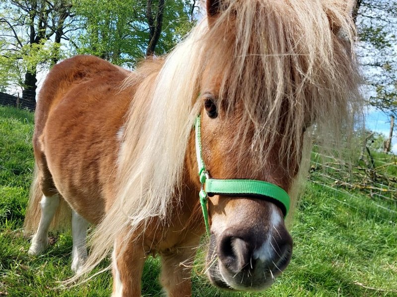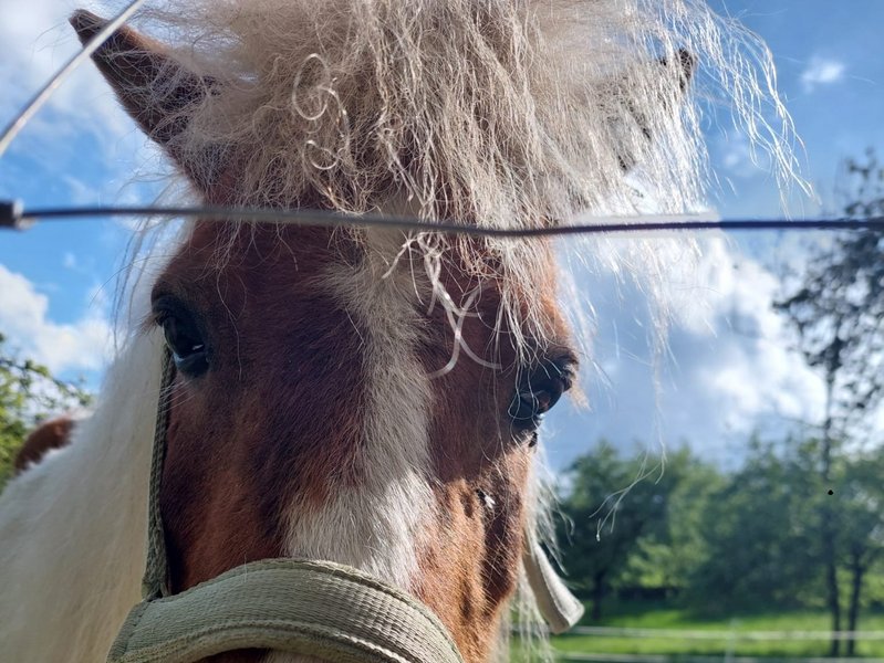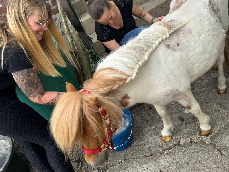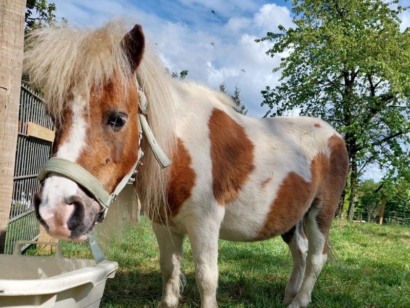 Die drei Shetland Ponys sind ursprünglich aus Holland und werden für die tiergestützte Arbeitstherapie genutzt. Die Bewohner/-innen haben die Aufgabe, sich um den Neuzugang zu kümmern: Spaziergänge, etwas Bodenarbeit, dazu gehört z.B. das Longieren und über Hindernisse gehen.