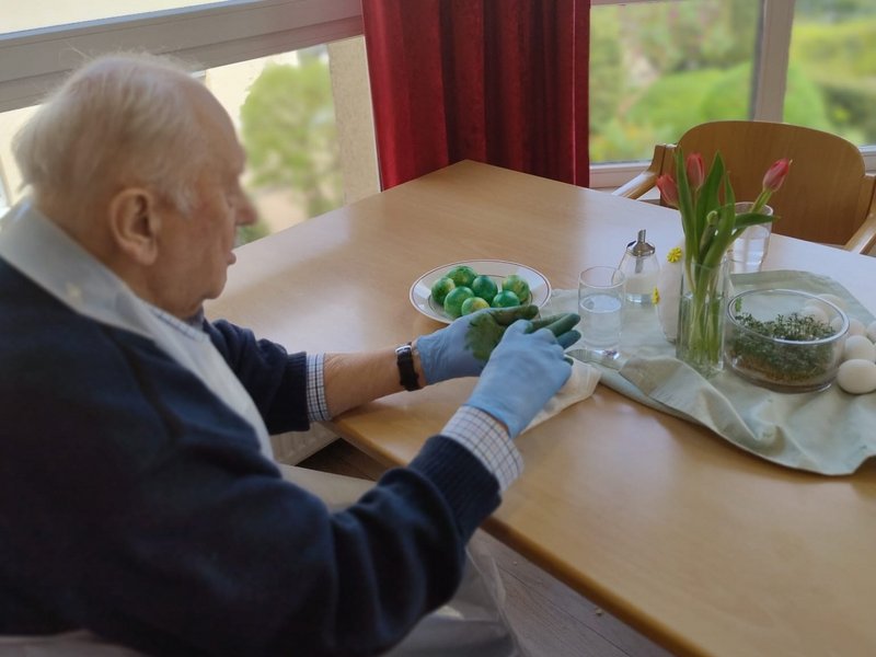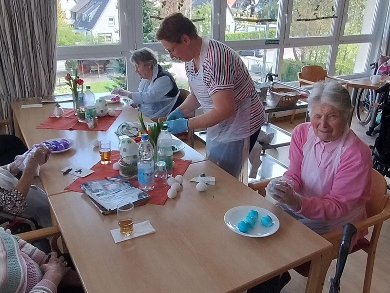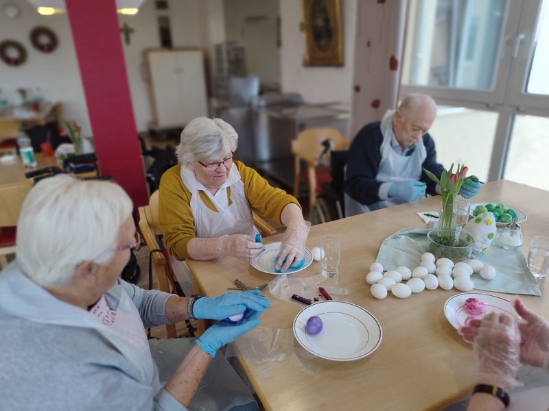 Das Osterfest wurde im St. Josefshaus mit viel Herz und Engagement gefeiert. Schon in den Tagen davor herrschte geschäftiges Treiben: Viele Bewohnerinnen und Bewohner waren voller Freude dabei, Eier zu färben, Kuchen zu backen und liebevoll die Osterdekoration zu gestalten. Auch beim Verpacken kleiner Geschenke wurde fleißig geholfen – überall lag ein Hauch von Frühling und Vorfreude in der Luft.