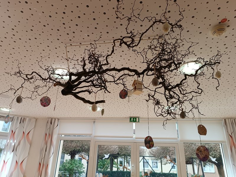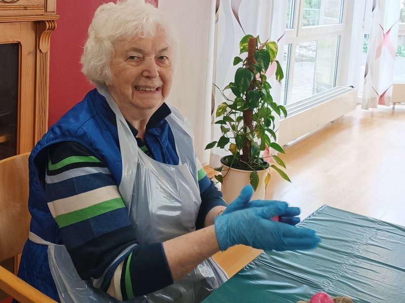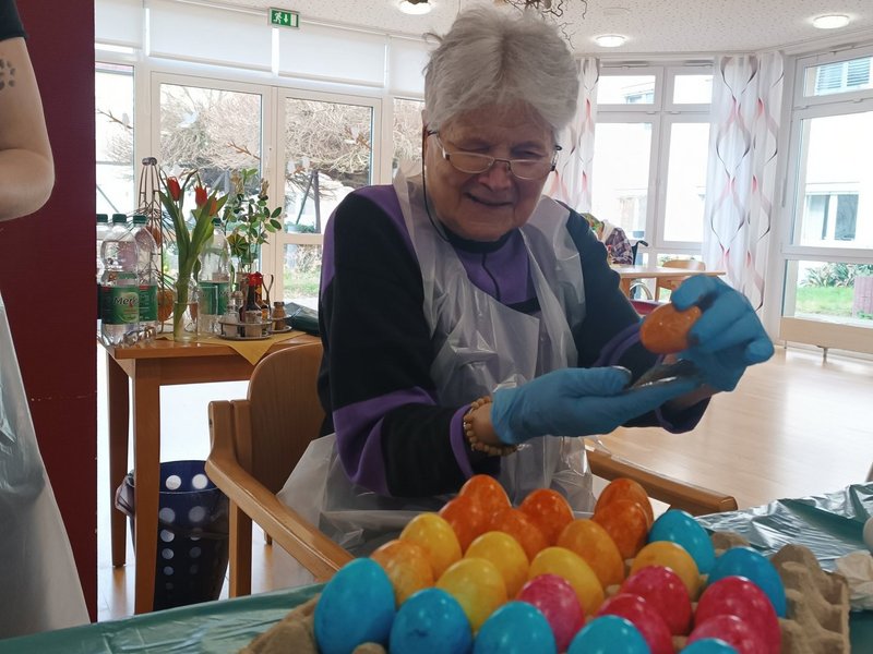 Die Seniorinnen und Senioren sind jedes Jahr wieder begeistert, wenn sie gemeinsam mit unseren Teams mithelfen können, unser Haus für Ostern vorzubereiten. Beim Eierfärben wird viel erzählt, zum Beispiel berichten die Bewohnerinnen und Bewohner, wie Eier früher gefärbt wurden und wie sie Ostern damals mit ihren Familien verbracht haben.