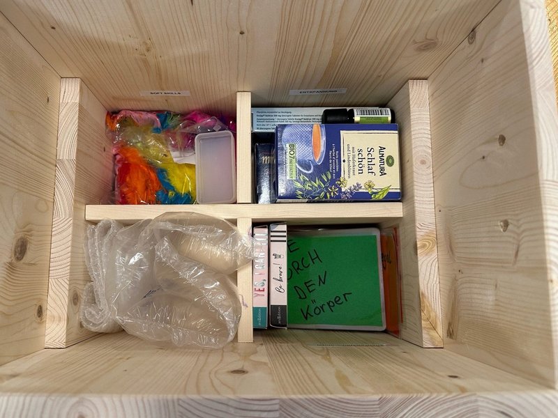 Die neue rollende Skills-Box steht im Medi-Zimmer neben der Liege. Die Skills-Kiste ist zur Inspiration und für den Notfall gedacht.