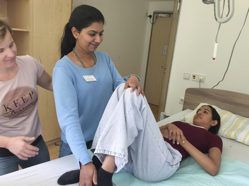 Natürlich stand auch Pflegepraxis auf dem Plan – und zwar zum Selbsterleben: Wie fühlt es sich an, mit einem Lifter aus dem Bett mobilisiert zu werden? Wie wichtig sind Empathie und Behutsamkeit bei Pflegemaßnahmen? Warum ist rückenschonendes Arbeiten schon ab Tag eins so entscheidend – und wie funktioniert das überhaupt? Auf dieser soliden Basis können unsere Azubis ihre Pflegekarriere aufbauen.