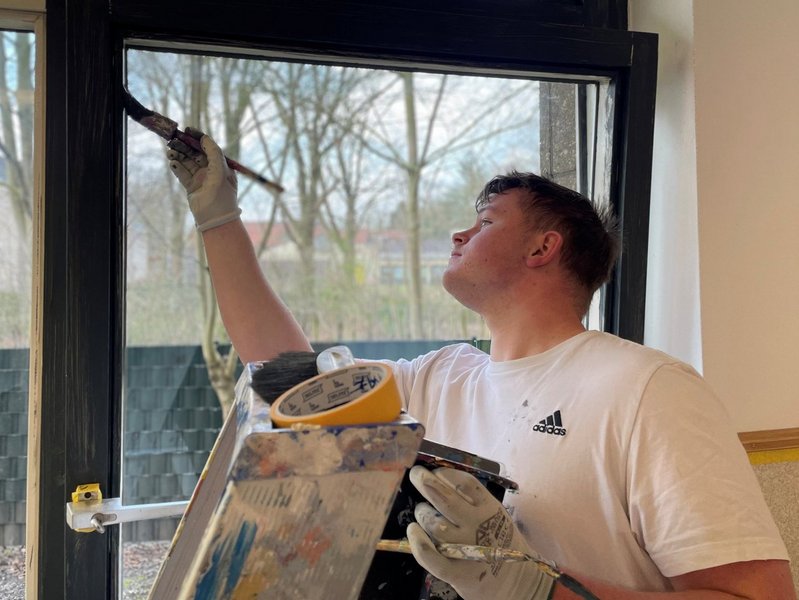 Im Frühjahr erblüht alles neu - das gilt auch für unsere Räumlichkeiten! Dank einer Kooperation mit der niederländischen Berufsschule Gilde Opleidingen sind aktuell zwölf Auszubildende der Maler/-innen und Lackierer/-innen aus der Niederlassung Roermond (NL) bei uns zu Gast. Gemeinsam mit ihrem Lehrer haben sie eine Mission: Unseren Tagesstrukturbereich zu verschönern. Während der fünf-wöchigen Aktion werden noch fünf weitere Räume (Küche, Flur, Multifunktions-, Snoezel-, und Aufenthaltsraum) bemalt und lackiert. Im Vorfeld wurde genau geplant: Neben der Umsetzung machten sich die Auszubildenden Gedanken zur malerischen Gestaltung aller Räume - sogar das Design-Team der Berufsschule war involviert.