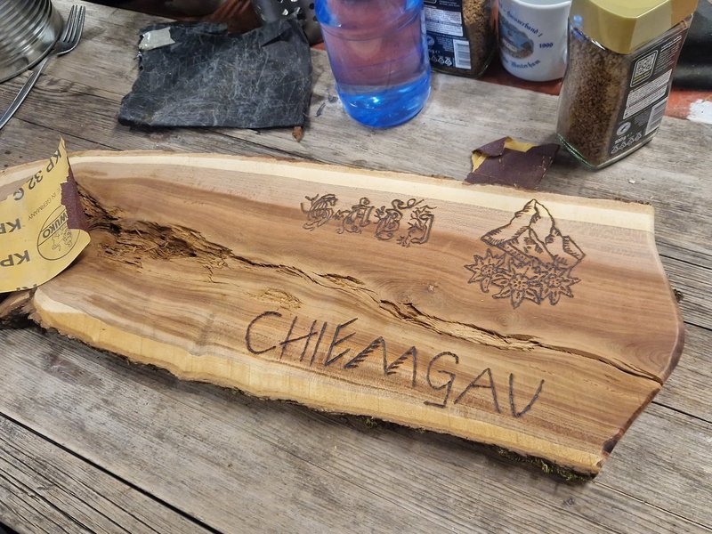 Im AT-Bereich Garten kreativ wird gerade ein alter Kontrabass-Kasten bearbeitet, geschliffen, bemalt und es entstehen Schilder/Bretter mit individueller "Brandmalerei".