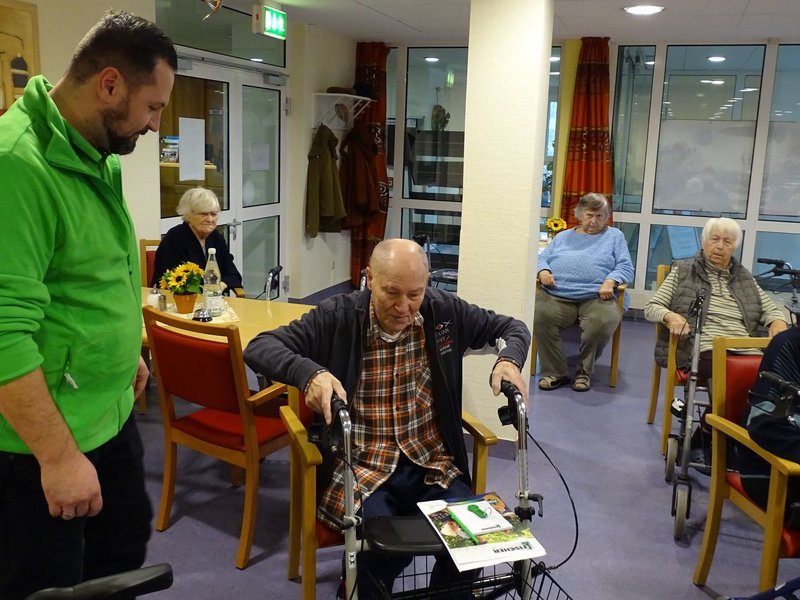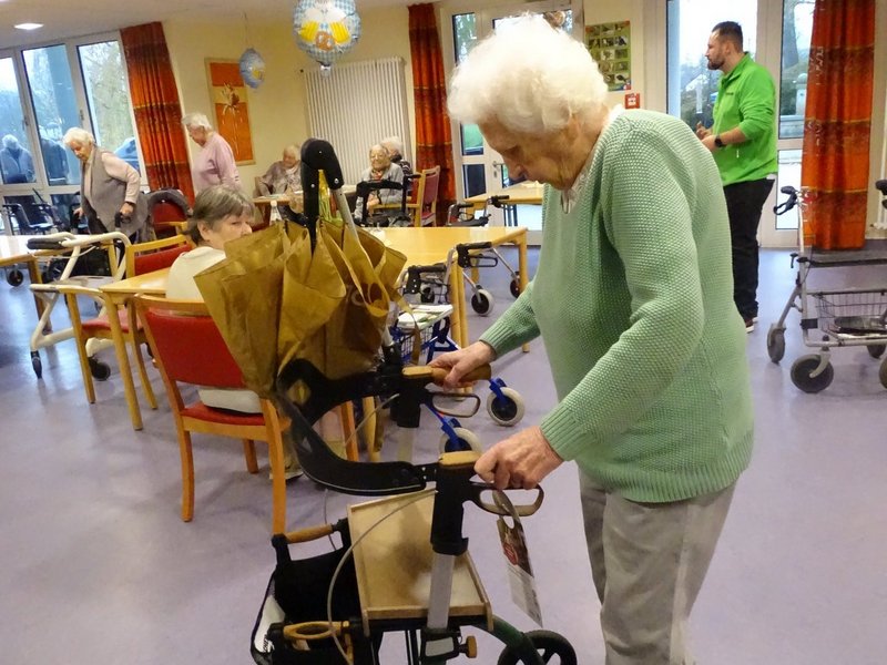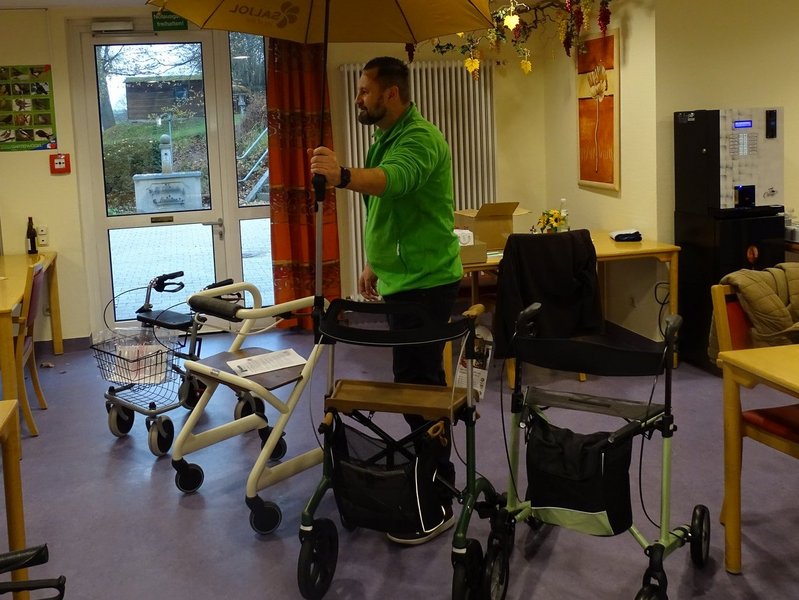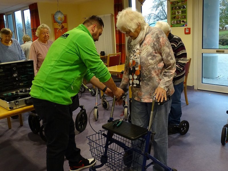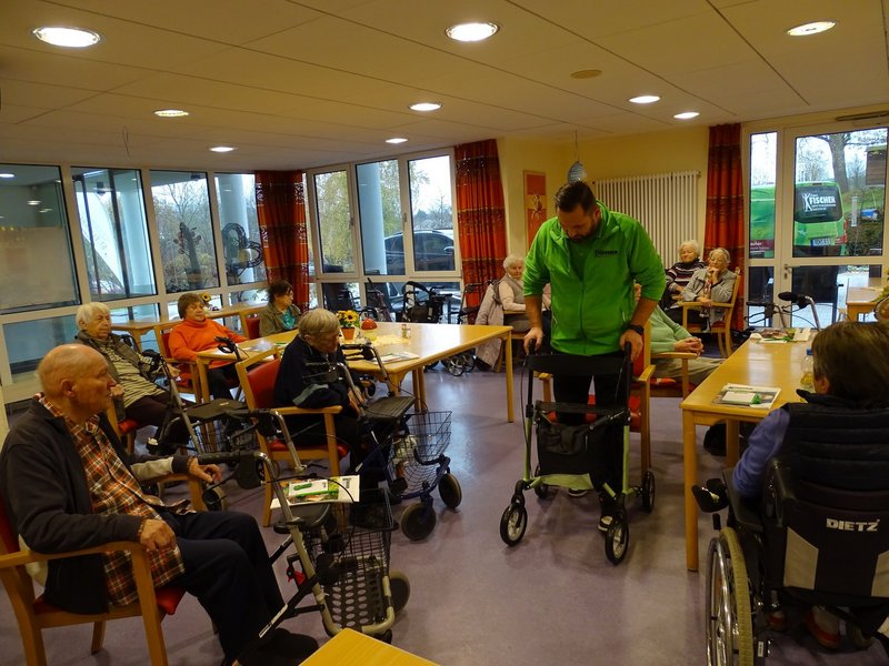 Herr Kuhn aus dem Robert Fischer Orthopädie-Schuhtechnik Sanitätshaus hat den Bewohnerinnen und Bewohnern verschiedene Rollatoren vorgestellt und auf die jeweiligen Bedürfnisse eingestellt.