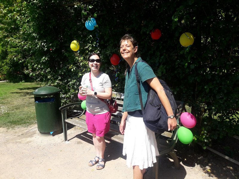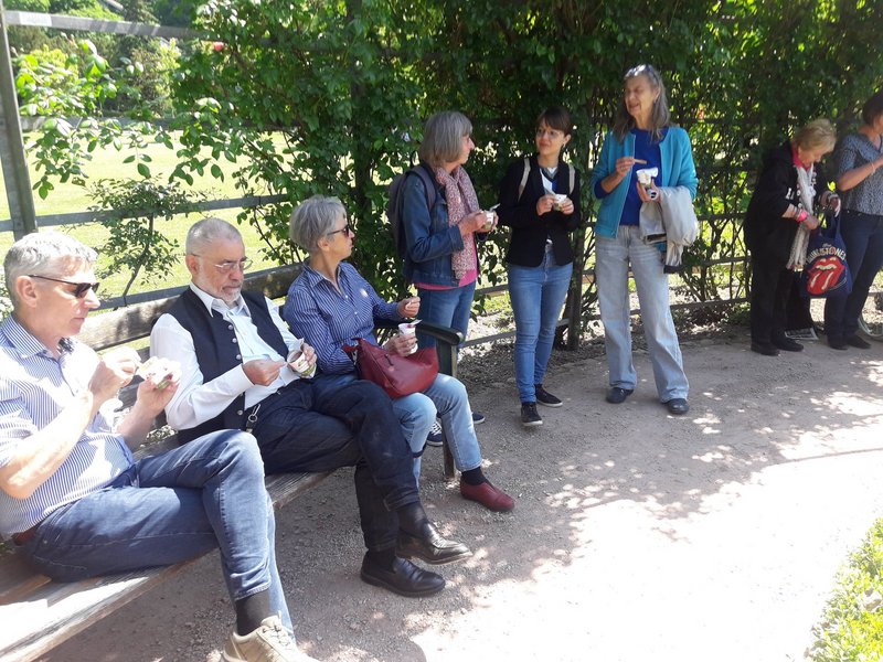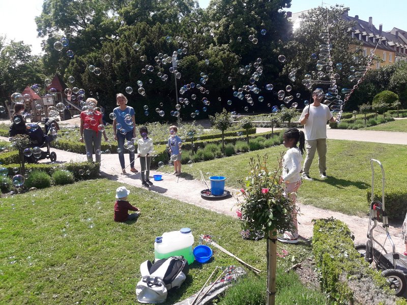 Im Rahmen der Woche der „Schwätzbänkle“ trafen sich im Rosengarten des Stadtgartens Freiburg verschiedene Institutionen und Gruppen, darunter das Seniorenbüro der Stadt, der Lokalverein Innenstadt Freiburg e.V., mehrere Stadtteilforen, kirchliche Einrichtungen, Begegnungszentren, Stiftungen sowie Bewohnerinnen und Bewohner aus dem Stadtteil. Auch Kinder, Familien, Studierende aus der Innenstadt und der „Seifenblasenmann“ Manuel waren dabei.