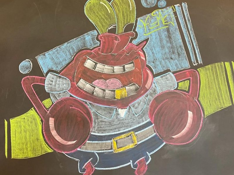 Unser Bewohner, Herr Br., hat neuerlich ein Wandbild mit Kreide für unseren Speisesaal gestaltet.