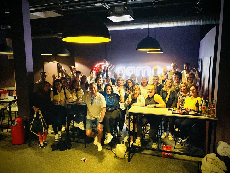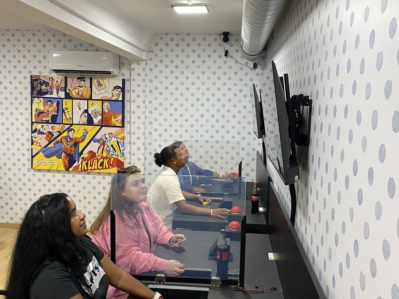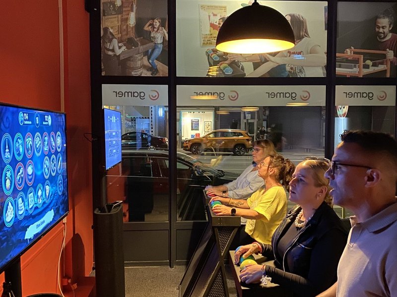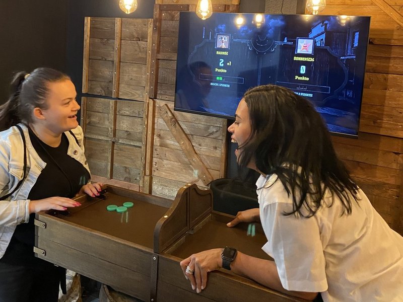 Zur Einstimmung stärkten wir uns im Biergarten am Schokoladenmuseum – bei leckerem Essen und kühlen Getränken starteten wir entspannt in den Tag. Anschließend ging es weiter zu einer ganz besonderen Location: „Gamer – Schlag Deine Kollegen!“, die erst in diesem Jahr ihre Türen geöffnet hat.