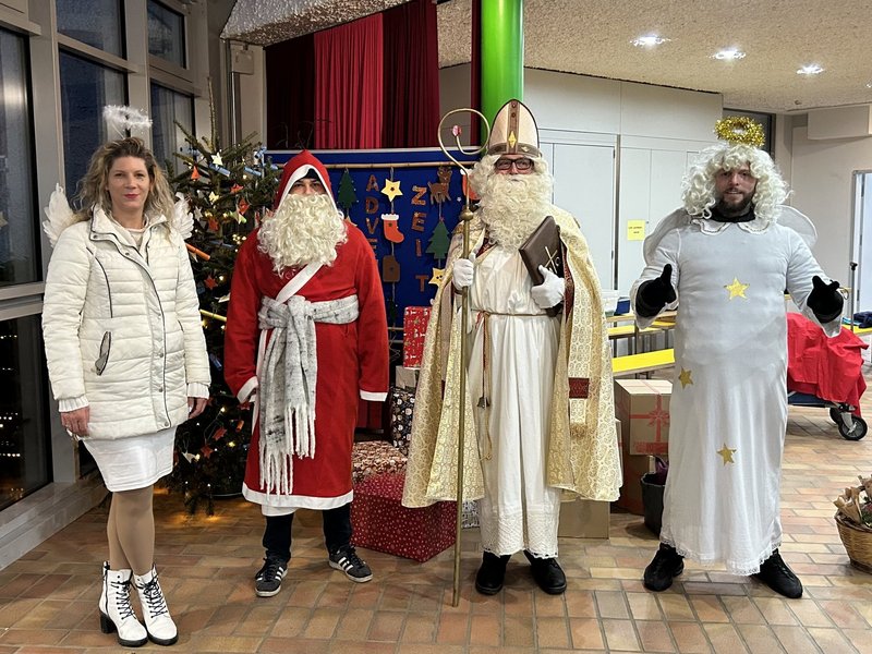 Drei Rehabilitand/-innen unterstützten den Nikolaus beim Weihnachtsmarkt und sorgten für freudige Gesichter, als sie Geschenke an Kinder verteilten.