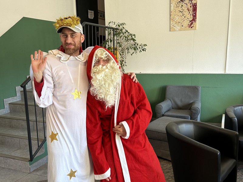Zwei Patienten haben den Nikolaus bei der Verteilung von Geschenken an Kinder unterstützt, indem sie sich als Weihnachtsmann und Engel verkleidet haben.