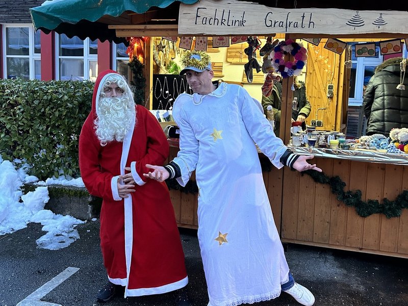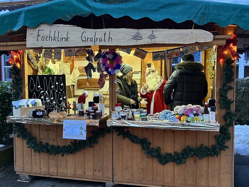 Mitarbeiter/-innen und Patient/-innen der Fachklinik Grafrath haben am Weihnachtsmarkt in Grafrath teilgenommen und dort die Arbeiten aus Ergotherapie und Arbeitstherapie verkauft. Zuvor haben viele Patient/-innen fleißig Holzarbeiten, Schmuck, Postkarten, Weihnachtskränze und andere tolle Dinge hergestellt und gebastelt.