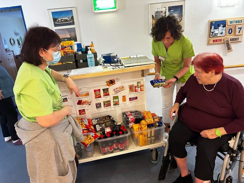 Jeden Mittwoch ist unser hauseigener Kiosk für die Bewohnerinnen und Bewohner auf vier Rädern unterwegs. Knabbereien, Süßes, Getränke und Kosmetikartikel können sich die Seniorinnen und Senioren aussuchen. Der Kioskwagen ist immer heißbegehrt und eine wunderbare Gelegenheit für ein besonderes Kauferlebnis.