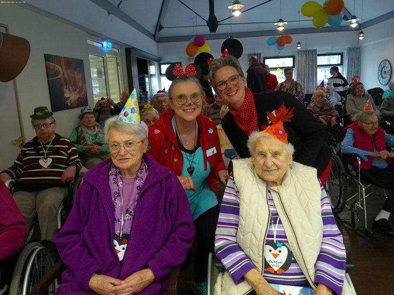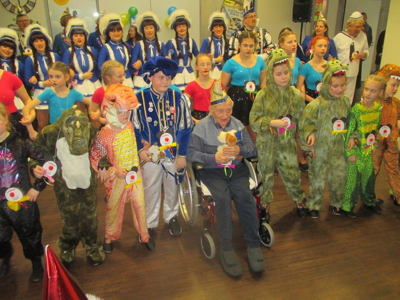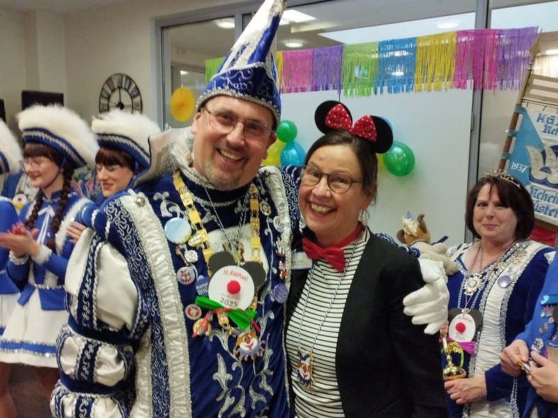 Doch damit war das bunte Faschingstreiben noch längst nicht vorbei: Die „lustigen Mäuse“ der sozialen Betreuung luden alle Bewohnenden zur Rosenmontagsfeier in die Aula ein. Frau Linnartz sorgte mit ihrer Gitarre und viel guter Laune für die musikalische Untermalung des Nachmittags und brachte alle zum Singen, Schunkeln und Klatschen. Das Haus durfte an diesem Tag große Persönlichkeiten (bzw. deren Doppelgänger) begrüßen: So waren z. B. Roy Black und Anita („Schön ist es auf der Welt zu sein“), Johannes Heesters („Ich werde 100 Jahre alt“) sowie Dick und Doof („Regentropfen, die an dein Fenster klopfen“) zu Gast. Ein Rollatortanz zum Lied „Ene Besuch im Zoo“ rundete die fröhliche Feier ab.