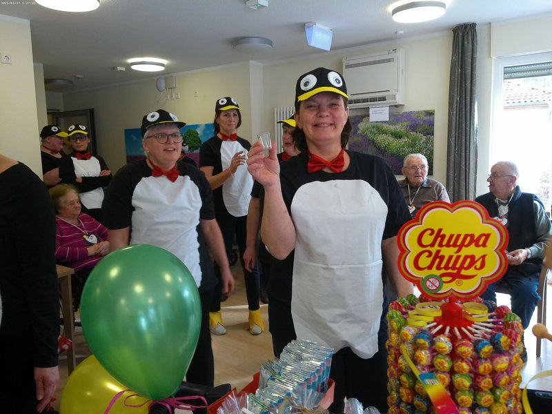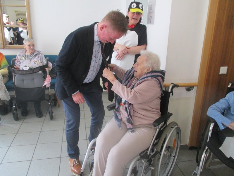 An Weiberfastnacht ging es rund: Die Kita-Kinder besuchten uns in ihren fantasievollen Konstümen und forderten unsere Bewohnenden und Mitarbeitenden zu lustigen Mitmachtänzen auf. Mit einer kunterbunten Faschingspolonaise brachten Groß und Klein die gute Stimmung und Freude in jeden Winkel unseres Hauses. Ganz traditionell waren auch unsere Damen der Hauswirtschaft mit einem kleinen Umzug unterwegs. Als Pinguine verkleidet verteilten sie selbstgebastelte Orden und süße Leckereien und ernteten jede Menge strahlende Gesichter. Pünktlich um 11:11 Uhr lockten die Pinguin-Ladies unseren Pflegedienstleiter Herrn Gremmer ins Forum. Dort wartete bereits eine unserer Bewohnerinnen mit einer Schere, um ihm feierlich und unter großem Jubel die Krawatte abzuschneiden.