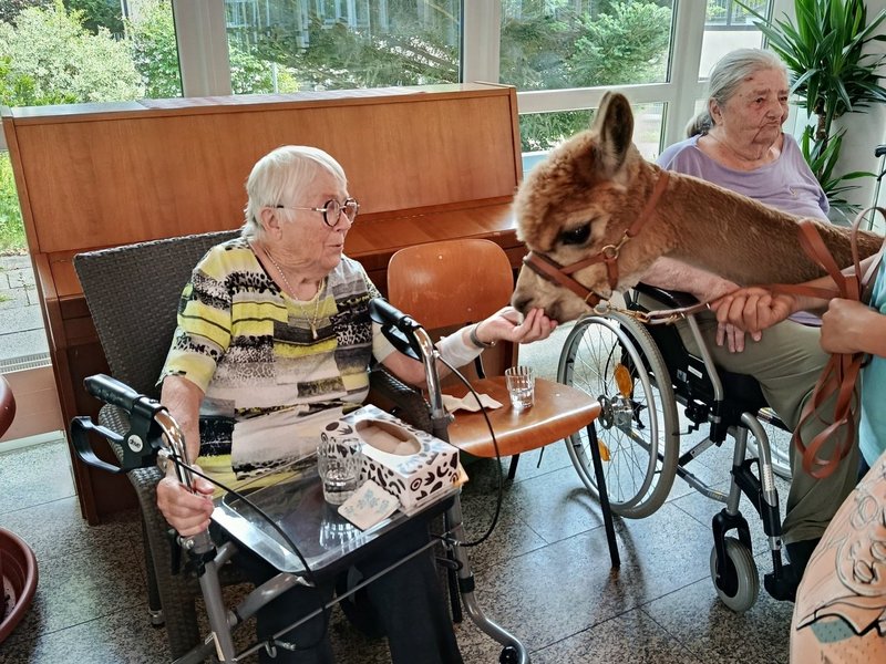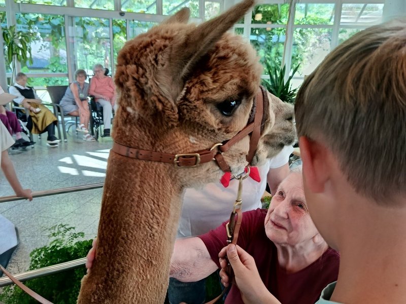 Die Urlaubswoche startete mit zünftiger Musik und Weißwurst. Der Musiker holte sich auch die Unterstützung der Bewohnerinnen und Bewohner. Am Nachmittag kamen die Alpakas zu Besuch. Für ein paar Leckerlis ließen sie sich gern streicheln.